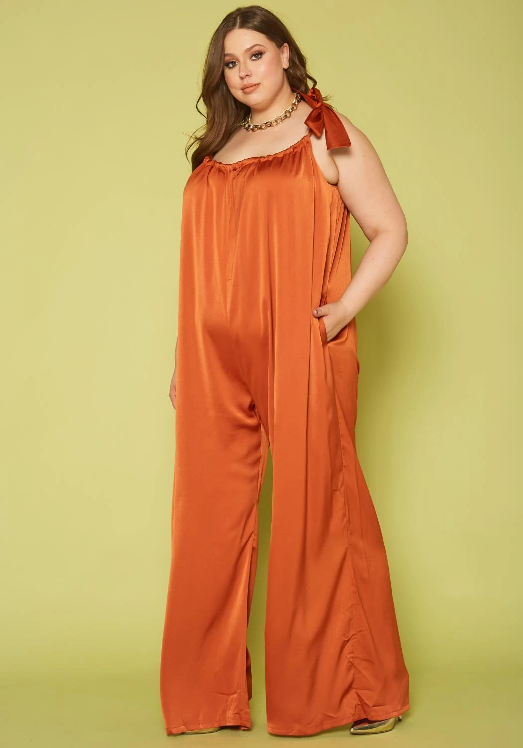 Effortless plus size women’s jumpsuit in self tie cami shoulder straps, square neck style and wide flare leg hem.