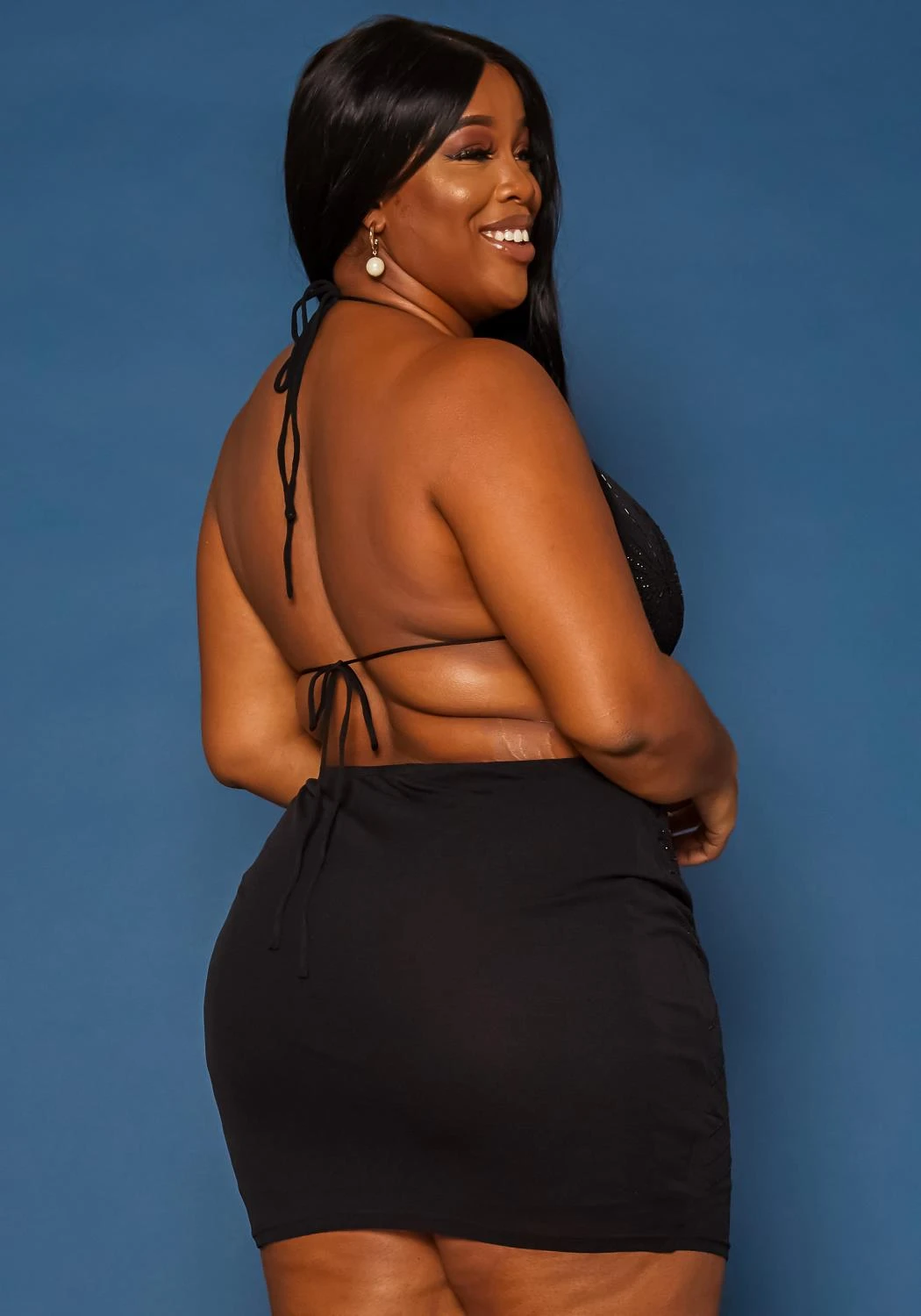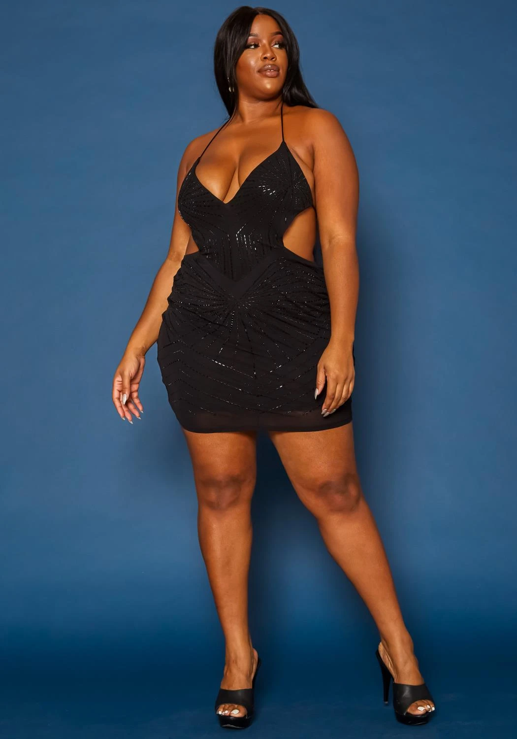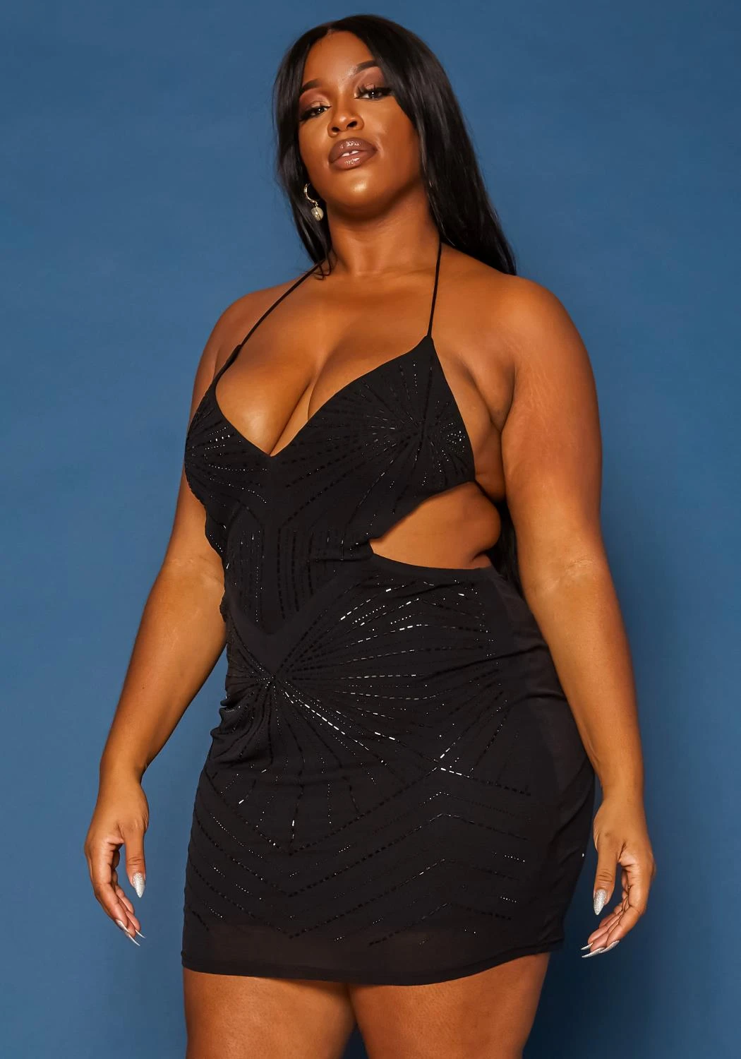 Perfect holiday dress for plus size women with sequin details, v-neck style, side cut-out, self-tie open back design and bodycon fitting.
