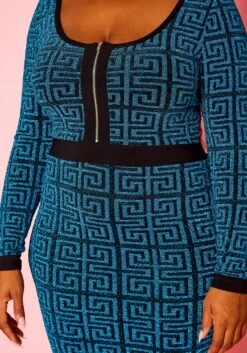 Stunning plus size women’s bodycon dress in shimmering greek key print, fitted long sleeves, scoop neck style, zip front hem and black lining.