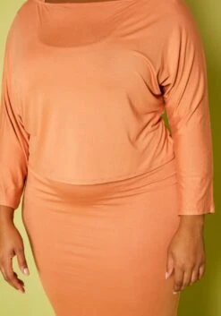Casual plus size women’s two piece set that features a asymmetric design maxi dress and long sleeve drop shoulder sweatshirt.