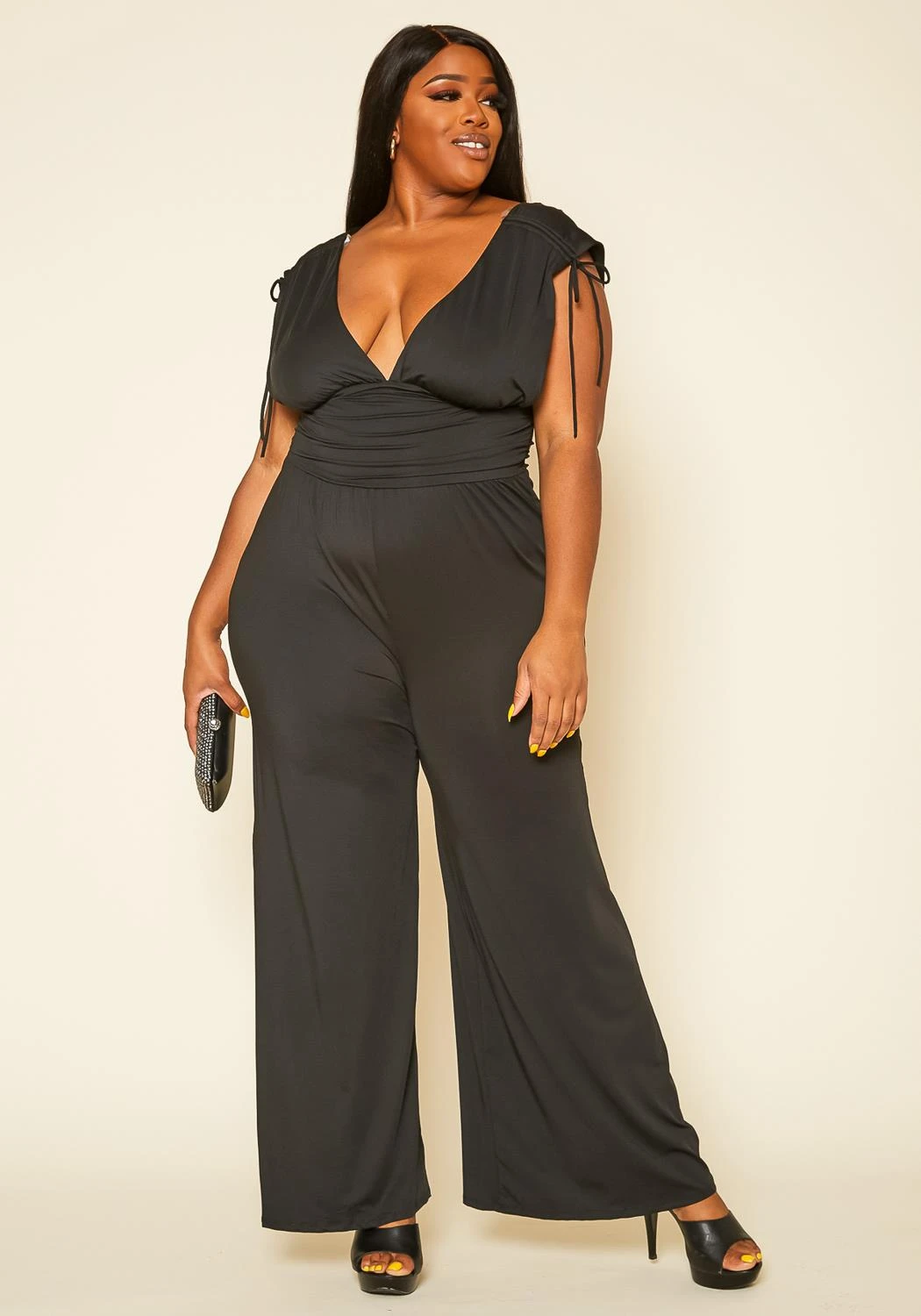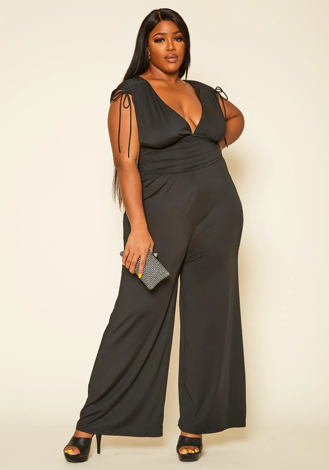 Plus size women’s jumpsuit in tank style with drawstring ascent, open side cleavage detail, side zipper closure, wide flare leg hem and front and back v-neck hem.
