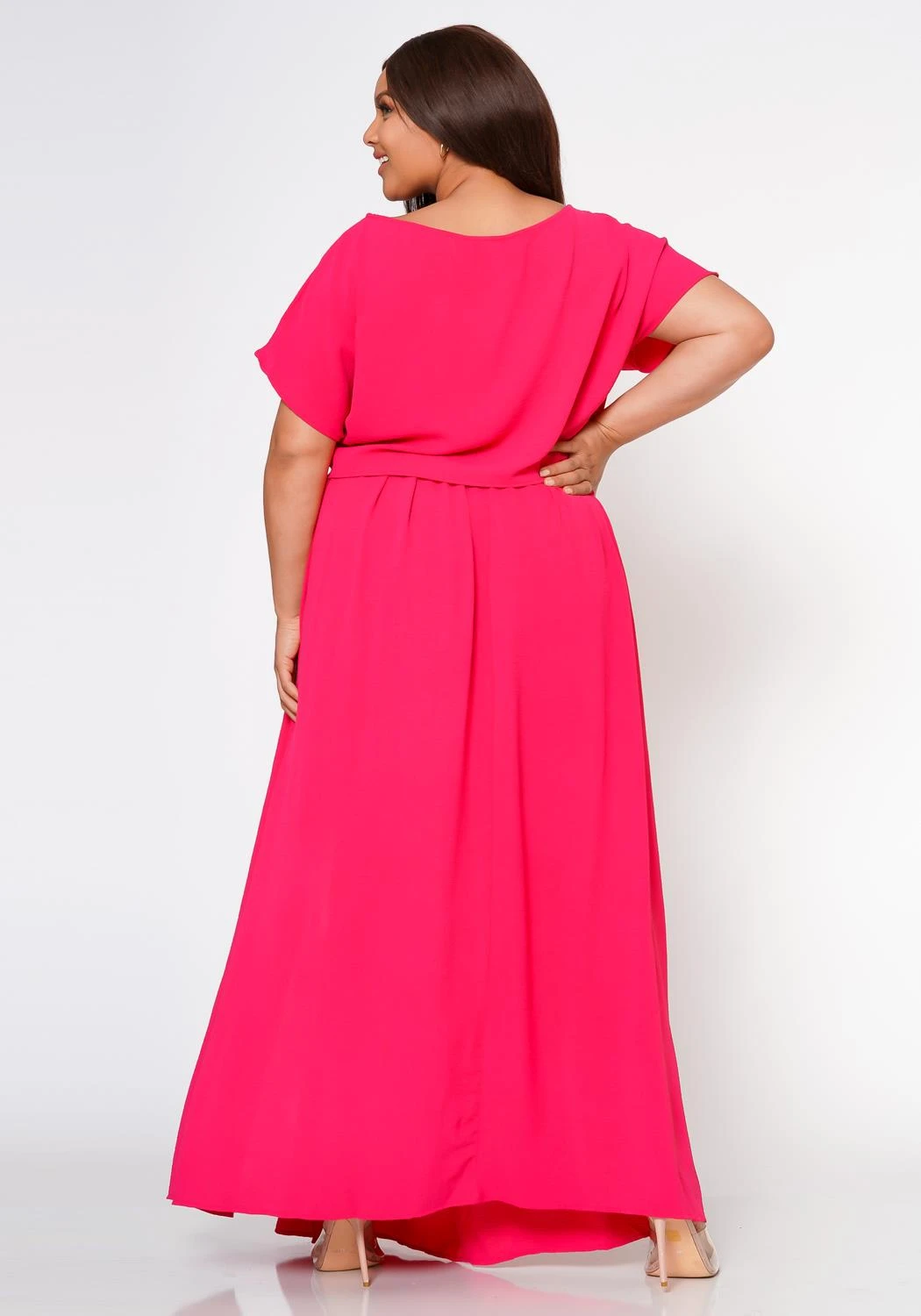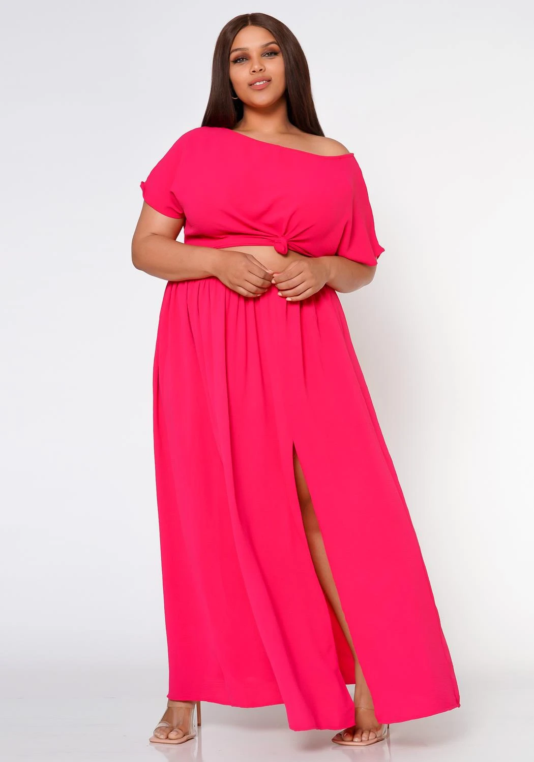 Plus size women’s effortless matching set which features a dolman short sleeve, boat neckline blouse and matching color high waist flare maxi skirt with single leg slit hem.