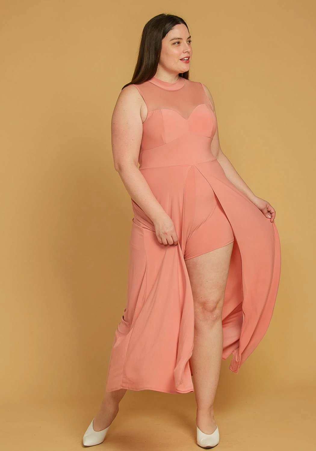 This plus size romper is unique in every way, with its long cape style skirt and illusion neckline.