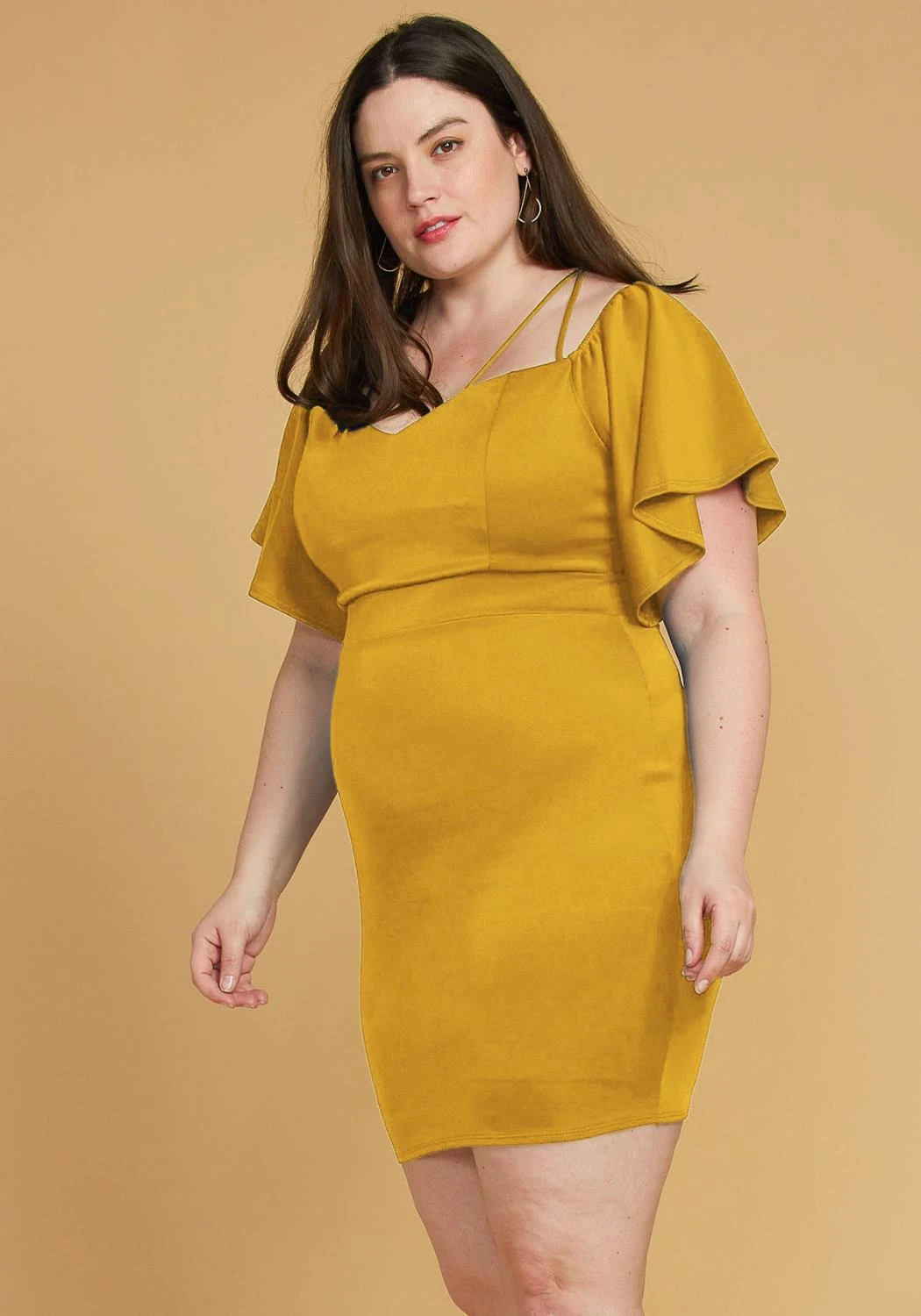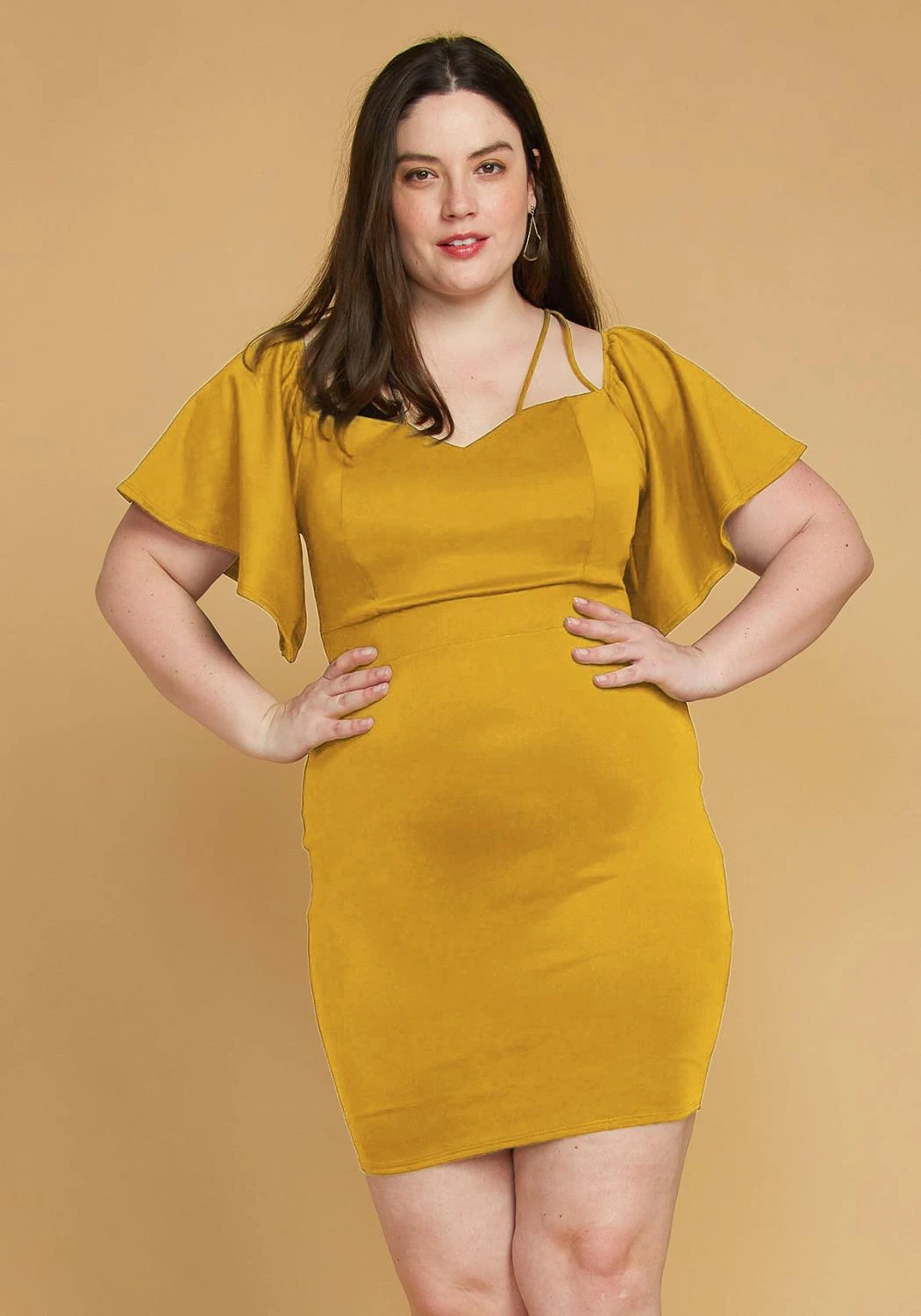 A sexy cocktail dress with bell sleeves, sweatheart neckline, and spaghetti straps detail.