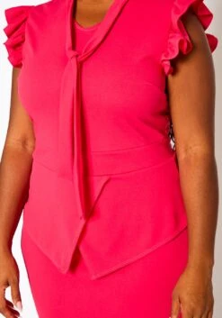 Plus size women’s midi dress with tie front detail, ruffle trim hem, overlay peplum design and back zipper closure.