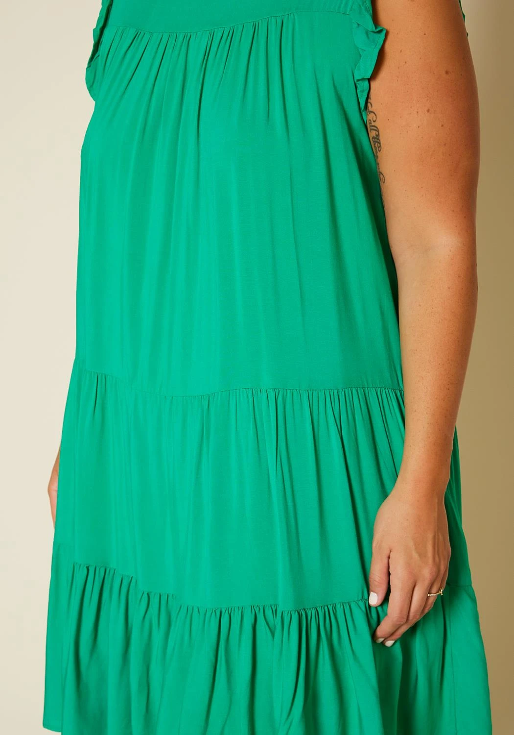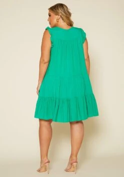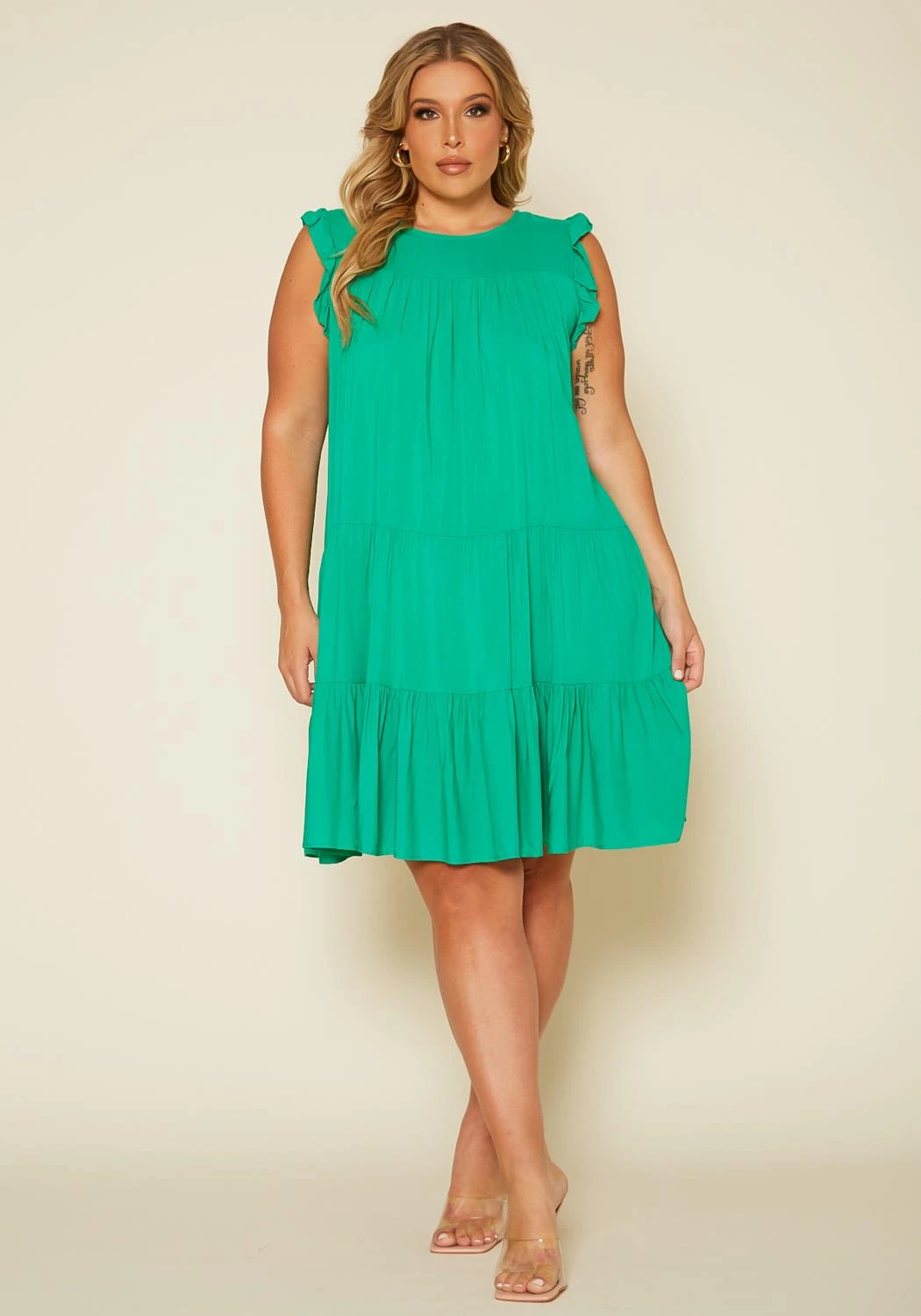 Plus size women’s dress in tiered style, featuring ruffle sleeveless hem, round neck hem, tiered & ruffle detail with back zipper closure.