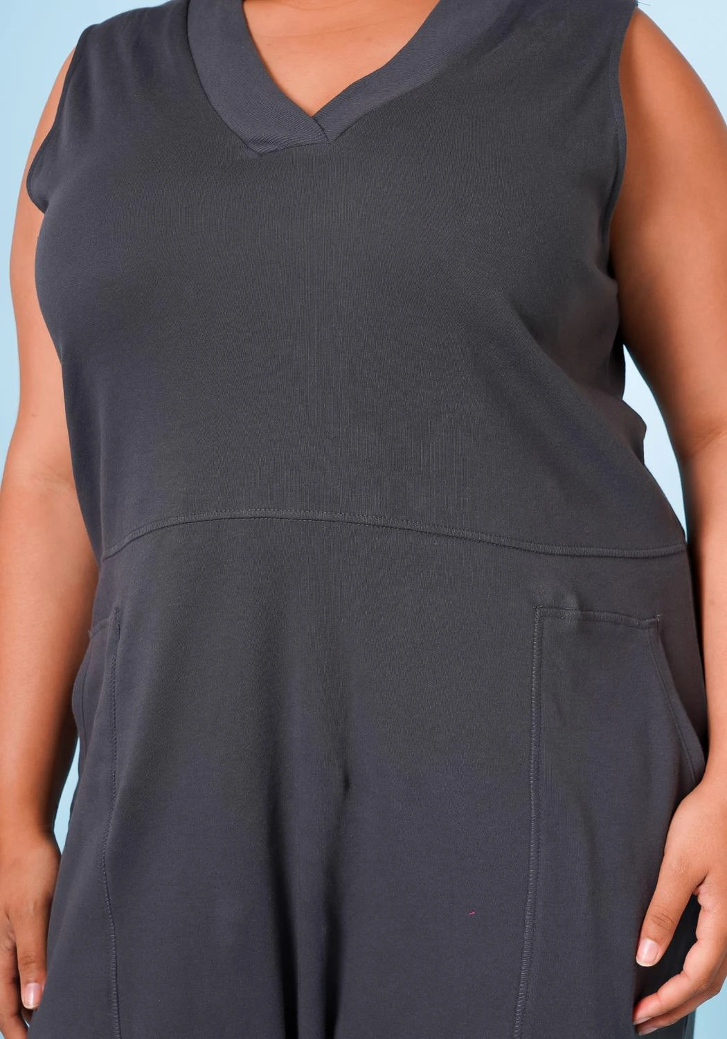 Plus size women’s jumpsuit in harem style featuring v-neck style, sleeveless design, side pockets & leg cuff hem ascent.