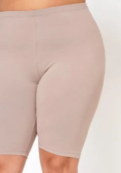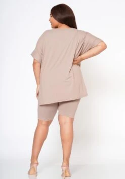 Plus size women’s two piece set featuring a high low, side slit detail, v-neck & rolled up detailed short sleeves t-shirt, paired with high- waist biker shorts.